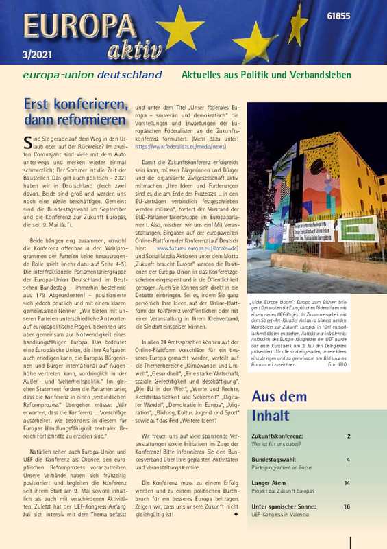 Die ersten Wahlplakate hängen seit Kurzem an den Laternenpfählen und das Ende einer Ära liegt in der Luft: Angela Merkel wird aus dem Kanzleramt ausziehen, soviel steht fest. Am 26. September wird ein neuer Bundestag gewählt - ein Ereignis, das, ebenso wie die Konferenz zur Zukunft Europas, entscheidende Bedeutung für uns Europa-Aktive hat! In dieser Ausgabe geht es ausführlich darum, wie europäisch die Wahlprogramme der Parteien sind, wer uns im Plenum der Zukunftskonferenz eigentlich vertritt und - besonders wichtig! - wie wir alle daran mitwirken können, über das Europa von morgen zu bestimmen.