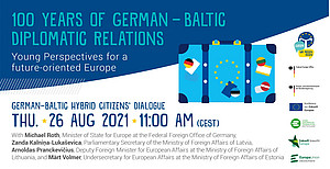 Seid am Donnerstag, den 26. August 2021 von 11:00 bis 12:30 Uhr im englischsprachigen Jugenddialog „100 Years of German-Baltic Diplomatic Relations – Young Perspectives for a future-oriented Europe” dabei. Verfolgt im Livestream wie junge Menschen aus Deutschland und dem Baltikum im Weltsaal des Auswärtigen Amtes vor Ort und digital in den offenen Dialog treten mit: