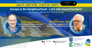 Wir laden sie am Freitag, den 21. Juli 2023, von 17:00 bis 18:30 Uhr (MESZ) herzlich zu unserem englischsprachigen Online-Bürgerdialog "Europe in the Neighbourhood - Let's talk beyond borders! Ukraine's path to EU membership" ein. Bringen Sie Ihre Anliegen und Fragen ein und treten Sie in den Dialog unter anderem mit: