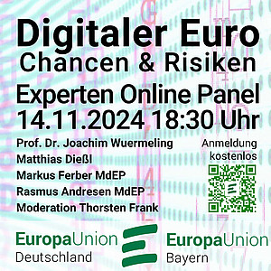 Am 14. November um 18:30 Uhr laden Europa-Union Bayern und Europa-Union Deutschland zu einer Online-Veranstaltung zum Digitalen Euro ein. Panel-Gäste sind Rasmus Andresen MdEP, Matthias Dießl, Präsident des Sparkassenverbandes Bayern, Markus Ferber MdEP und Prof. Dr. Joachim Wuermeling, ehem. Vorstandsmitglied der Deutschen Bundesbank. » weiterlesen